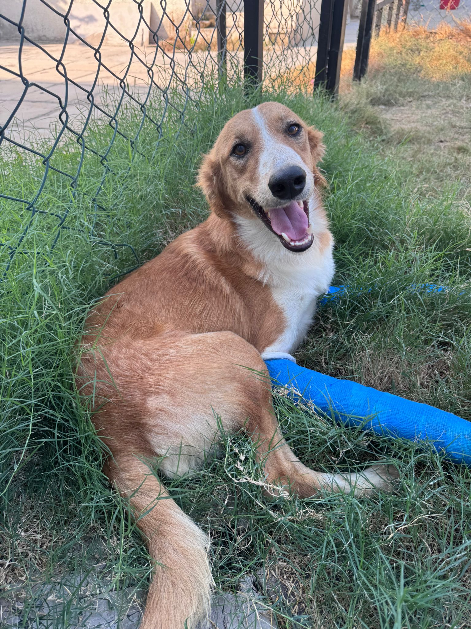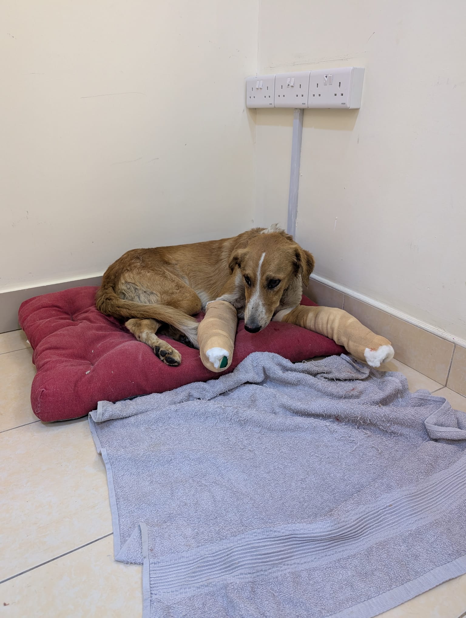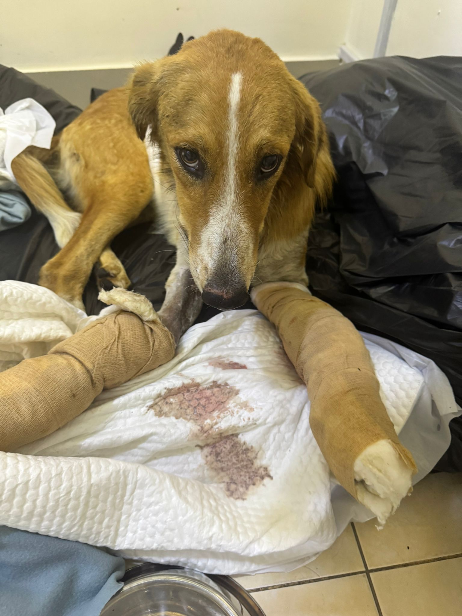 Lovely Pogo was left for dead in the industrial area with two severely broken front legs. Undergoing treatment now. Very gentle, sweet and playful despite the pain she has endured
